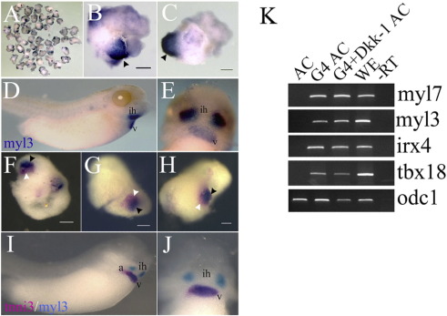 Fig. 1. GATA4 induces the expression of ventricular and proepicardial markers in animal cap explants. (A) Ventricular gene expression is induced in animal cap explants injected with GATA4 (75%, n = 50) using WMISH analysis for the expression of myl3. (B, C) Close-up of animal cap explants shown in (A); black arrowheads are indicating myl3 expression. (D, E) Lateral and ventral views of a myl3 expression in control embryo (stage 39). (FâH) Animal caps injected with GATA4 showed incompletely overlapping expression of pan-myocardial marker tnni3 and ventricular marker myl3 (36% (n = 55), 13% showed tnni3 expression only). Similarly to the heart of control embryos (I, J), GATA4 injected AC explants show a region of overlapping expression (black arrowheads) and region expressing tnni3 alone (white arrowhead). (K) RT-PCR analysis in AC explants at stage 40 injected with GATA4 or co-injected with GATA4 and Dkk-1 mRNA showed the expression of the ventricular (myl3 and irx4) and proepicardial (tbx18) markers as in sibling control embryos at the same stage. A representative experiment out of 3 repeats is shown. a, atrium; ih, interhyoid muscle of the jaw; v, ventricle. The scale bar corresponds to 100 μm. |