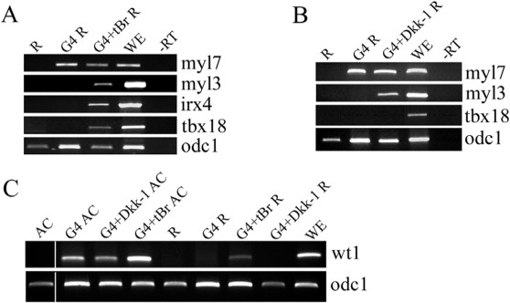 Fig. 2. Cardiac cell diversification is lost in dissociated and reaggregated animal cap explants but can be restored by blocking BMP signalling. (A) Restricted cardiac gene expression is lost in GATA4 injected explants dissociated and reaggregated. Inhibition of BMP signalling through dominant-negative BMP type I receptor (tBr) restores ventricular and proepicardial gene expression in GATA4 co-injected reaggregated explants. (B). Ventricular gene expression (myl3) is partially restored in explants also co-injected with GATA4 and Dkk-1 mRNA. (C) The second proepicardial marker, WT1, shows the same pattern of expression as Tbx18 in intact (Fig. 1K) and reaggregated animal cap explants expressing GATA4, GATA4 and Dkk-1 or GATA4 and tBr. AC, Animal Caps; G4, GATA4; R, dissociated and reaggregated animal caps. RT-PCR was performed at stage 40 according to control embryos. A representative experiment is shown out of 3 (A, B) or 2 (C). |