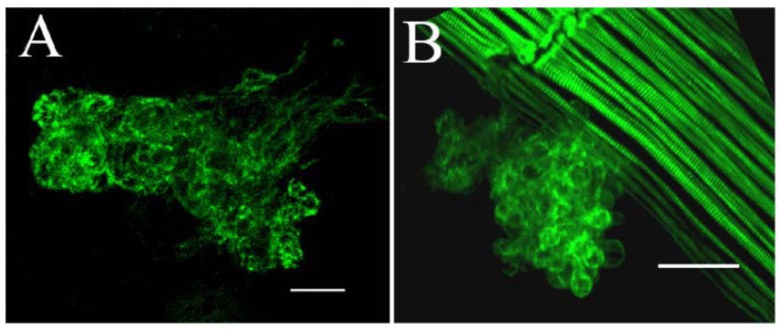 Figure S1. Morphogenesis of Second Hearts. Confocal microscopy was performed on SH (n=41; 73% beating) which were visualised by immunohistochemistry using anti-tropomyosin antibody CH1. (A) 35% of the SH showed morphology similar to a linear heart tube whilst (B) remaining SH were unstructured. (B) shows skeletal muscle staining in addition to SH. |