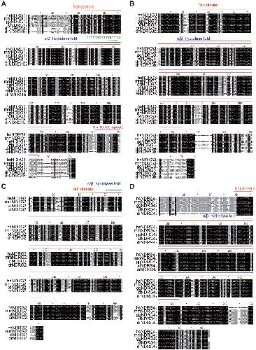Fig. 1. Amino acid sequences alignment of the Ndrg genes. (A-D) Amino acid sequences of Ndrg1, 2, 3, and 4 from different vertebrates were aligned respectively. Amino acid sequences were collected from human (Homo sapiens), mouse (Mus musculus), chicken (Gallus gallus), frog (Xenopus tropicalis), and zebrafish (Danio rerio). Identity residues from zebrafish to mammals are shown in black, and similarity sites are shown in gray. The red, blue, green and pink lines indicate Ndr domain, a/b hydrolase-fold motif, phosphopantetheine site and 3×10 AA (GTRSRSHTSE) tandem repeats, respectively. Abbreviations: hs (Homo sapiens), mm (Mus musculus), gg, (Gallus gallus), xt (Xenopus tropicalis), dr (Danio rerio). |