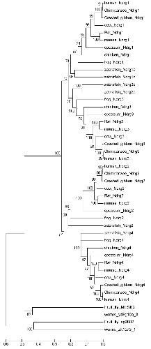 Fig. 2. Phylogenetic tree of the Ndrg genes. The CDSs of the Ndrg genes were obtained from human (Homo sapiens), chimpanzee (Pan troglodytes), gibbion (Nomascus leucogenys), cow (Bos taurus), rat (Rattus norvegicus), mouse (Mus musculus), opossum (Monodelphis domestica), chicken (Gallus gallus), frog (Xenopus tropicalis), zebrafish (Danio rerio), fruit fly (Drosophila melanogaster), and worm (Caenorhabditis elegans). NJ based phylogenetic tree was constructed by MEGA5 software. Numbers on branch nodes are bootstrap replication values. The scale bar represents the number of amino acids substitutions. |