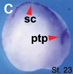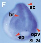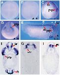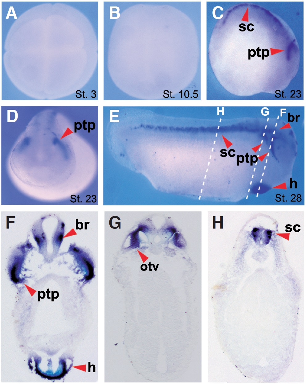 Fig. 6 (Left). The spatial expression pattern of Ndrg3 during Xenopus tropicalis embryogenesis. (A,B) Animal view. (C,E) Lateral view, dorsal to the top and anterior to the right. (D) Anterior view, dorsal to the top. (F-H) Transverse paraffin sections of stage 28 embryos after WISH. Abbreviations: br (brain), h (heart), ptp (profundal and trigeminal placodes/ganglia), otv (otic vesicle), sc (spinal cord). |
