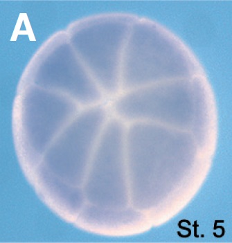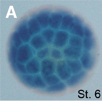 ndrg1 (N-myc downstream regulated 1) gene expression in Xenopus tropicalis embryo, assayed via in situ hybridization, NF stage 3, animal view. |