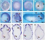 Fig.5. The spatial expression pattern of Ndrg2 during Xenopus tropicalis embryogenesis. (A,B) Animal view. (C,D) Dorsal view, anterior to the top. (E,G) Lateral view, dorsal to the top and anterior to the right. (F) Anterior view, dorsal to the top. (H-K) Transverse paraffin sections of stage 28 embryos after WISH. Abbreviations: br (brain), ep (epidermis), nf (neural fold), nt (neural tube), opv (optic vesicle), otv (otic vesicle), sc (spinal cord). |