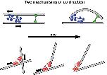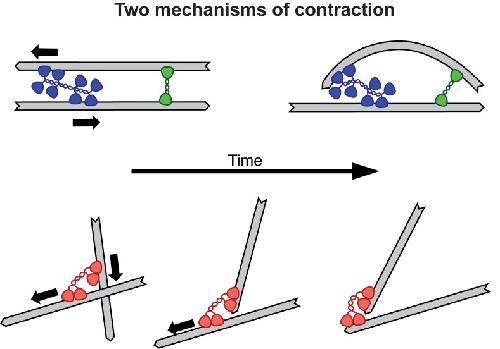 Figure 1. Two mechanisms for contraction: buckling and end clustering.Top: When two anti-parallel actin filaments are bridged by a myosin motor (blue) and a crosslink (green), their relative movement forces one filament to buckle, resulting in the contraction of the network. Bottom: Microtubule contraction seems to depend on the affinity of dynein motors (red) for the ends of the filaments. For a recent review on the topic of contraction, see Clark et al., 2014.