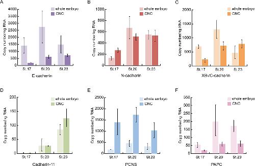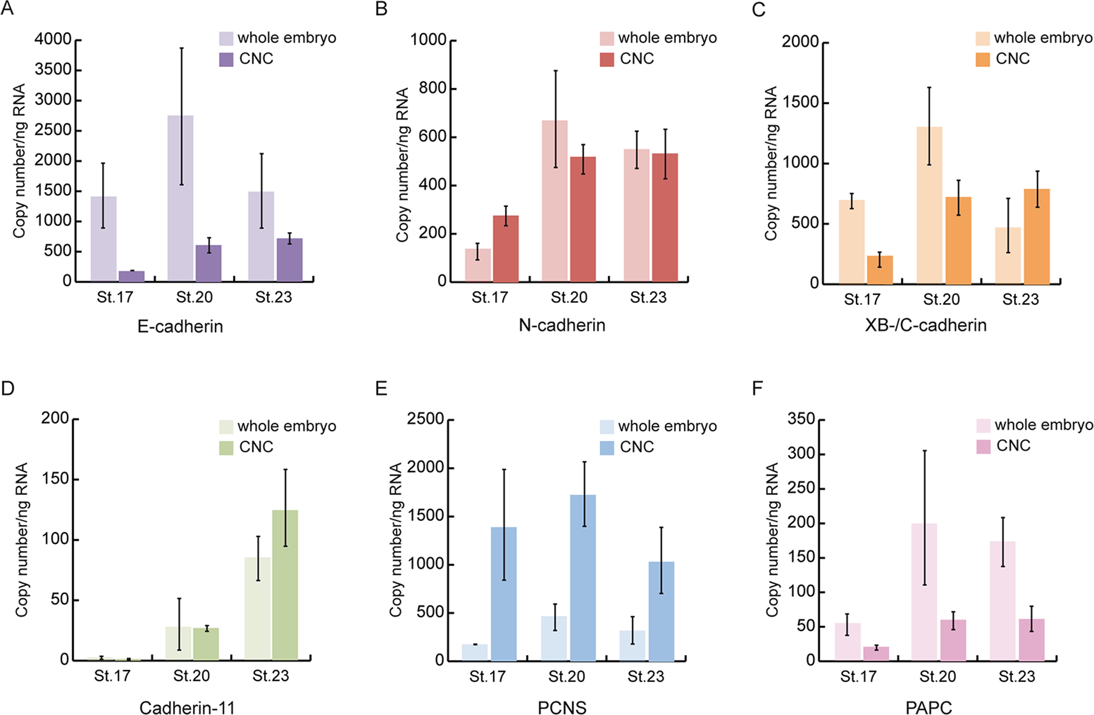Whole embryo samples and CNC explants were collected at the indicated stages and same amount of total RNA (150 ng) was deployed for PCR amplification. Copy numbers of (A) E-cadherin, (B) N-cadherin, (C) XB/C-cadherin, (D) Cadherin-11, (E) PCNS and (F) PAPC were determined via absolute quantification of RT-qPCR and copy numbers per ng of RNA were plotted. At least three independent quantifications were performed and the bars indicate mean values with standard deviations.