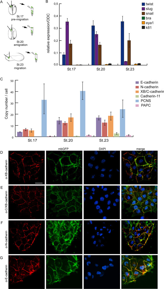 Fig. 1. Expression profile of different cadherin subtypes in Xenopus cranial neural crest (CNC) cells. (A) cDNAs for real-time PCR quantification were synthesized using RNAs extracted from Xenopus CNC explants at stage 17, 20 and 23, respectively. (B) The identities of sample tissues were validated via RT-qPCR amplification with different tissue markers. CNC markers twist, slug and snail were present in high abundance in CNC samples throughout all three assayed stages. The mesodermal marker bra, the placodal marker eya1 and the epithelial marker k81 were barely detectable in all CNC samples. All values were normalized and calibrated to the expression of the reference gene ornithine decarboxylase (ODC) (expression of ODC=1). (C) Copy number (per cell) of E-, N-, XB/C-cadherin, Cadherin-11, PCNS and PAPC in CNC during migration. Copy number of each cadherin was calculated by absolute quantification using standard curves. At least three independent quantifications were performed and the bars indicate average values with standard deviations. Immunofluorescence staining of endogenous XB-cadherin (D), C/XB-cadherin (E), N-cadherin (F) and E-cadherin (G) on CNC explants. CNC cells were labelled with membrane GFP and explanted on a fibronectin-coated surface at stage 17. DAPI staining was used to visualize cell nuclei. All cadherins are prominently localized at cellâcell contacts. Scale bar: 10 μm.