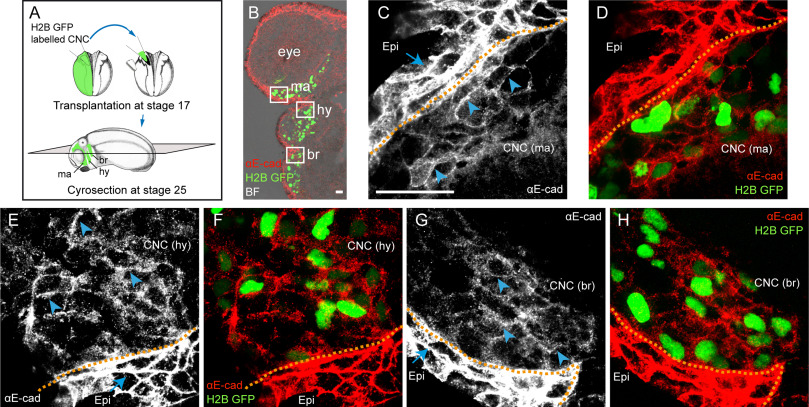 Fig. 2. E-cadherin is expressed in CNC in vivo. (A) Schematics of the experimental approach for labelling CNC cells in whole embryo sections: Xenopus embryo was injected with H2B GFP mRNA and labelled CNC cells were transplanted into another unlabelled wild type host embryo. Transplanted embryos were fixed at stage 25 and transverse sectioned. (BâH) Immunofluorescence staining against endogenous E-cadherin: (B) Mandibular, hyoid and branchial subpopulation of CNC were labelled by H2B GFP in whole embryo section. Cropped image of mandibular (C,D), hyoid (E,F) and branchial (G,H) showed in detail E-cadherin expression at cellâcell contacts. Dashed orange lines indicate the boundaries between epithelia and CNC. Arrows show the staining of E-cadherin in epithelia, arrowheads indicate the staining of E-cadherin in CNC. α-E-cad: anti-E-cadherin antibody; H2B GFP: CNC injected with H2B GFP mRNA; BF: bright field; ma: mandibular; hy: hyoid; br: branchial; Epi: epithelia. Scale bar: 20 μm.