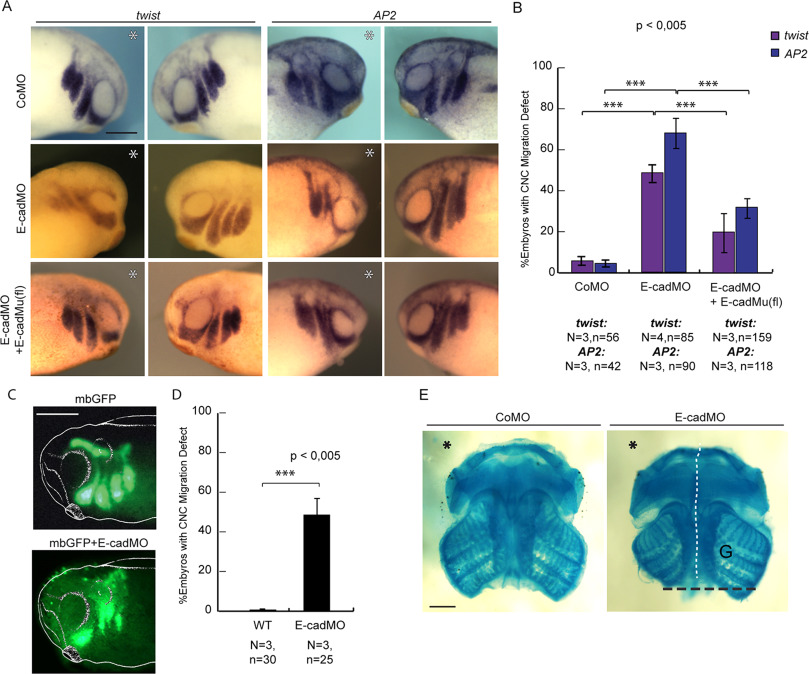 Fig. 3. E-cadherin knockdown blocks CNC migration in vivo. (A) In situ hybridization of CoMO and E-cadMO injected embryos with CNC marker twist and AP2 demonstrates that E-cadherin knockdown causes CNC migration defect. The migration can be restored by co-injection of E-cadMO resistant full-length E-cadherin. (B) Statistic of the in situ hybridization. N=number of experiments and n=number of embryos. (C) Transplanted E-cadherin knockdown CNC cells were in contrast to mbGFP injected CNC cells unable to migrate ventrally into the branchial arches. (D) Statistic of the transplantation experiment. (E) E-cadherin knockdown in CNC cells leads to branchial specific cartilage defect. Ventral view of control morpholino (CoMO) and E-cadherin morpholino injected embryo after cartilage staining with Alcian Blue at stage 44 is shown. Black dashed line indicates the reduced gillcartilage on E-cadherin depleted side of the embryo. White dashed line shows the middle line of the entire cartilage structure. * Indicates injected site and bars show the mean percentage of embryos with CNC migration defect with standard deviations. Significance is calculated according to fisherâs exact test. Scale bar: 200 μm.