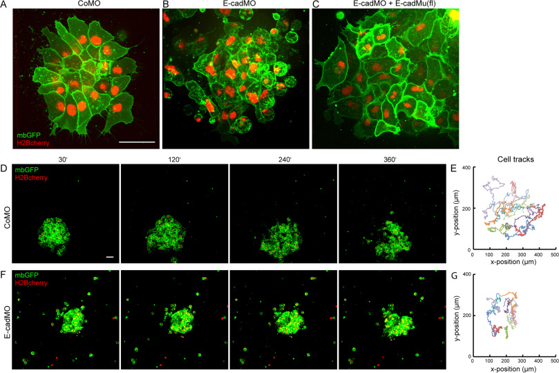 Fig. 5. E-cadherin knockdown CNC cells fail to form cell protrusions and displayed reduced motility. (A) CoMO injected CNC explanted on fibronectin-coated surface displayed extensive protrusion formation. (B) E-cadMO treated CNC explant cells exhibited less cell protrusions and showed cell blebbing. (C) Co-injection of full-length E-cadherin rescued cell protrusion formation in E-cadherin morphant CNC cells. (D) Time-lapse images of highly motile CoMO injected CNC explant over six hours. (E) Paths of ten randomly selected cells were traced over six hours and plotted in a diagram. (F) E-cadherin knockdown CNC explant showed restrained motility and individual cells migrated shorter distances (G). CNC cells were labelled with membrane GFP (mbGFP) and histon 2B cherry (H2B cherry) and explanted at stage 17. Scale bar: 50 μm.