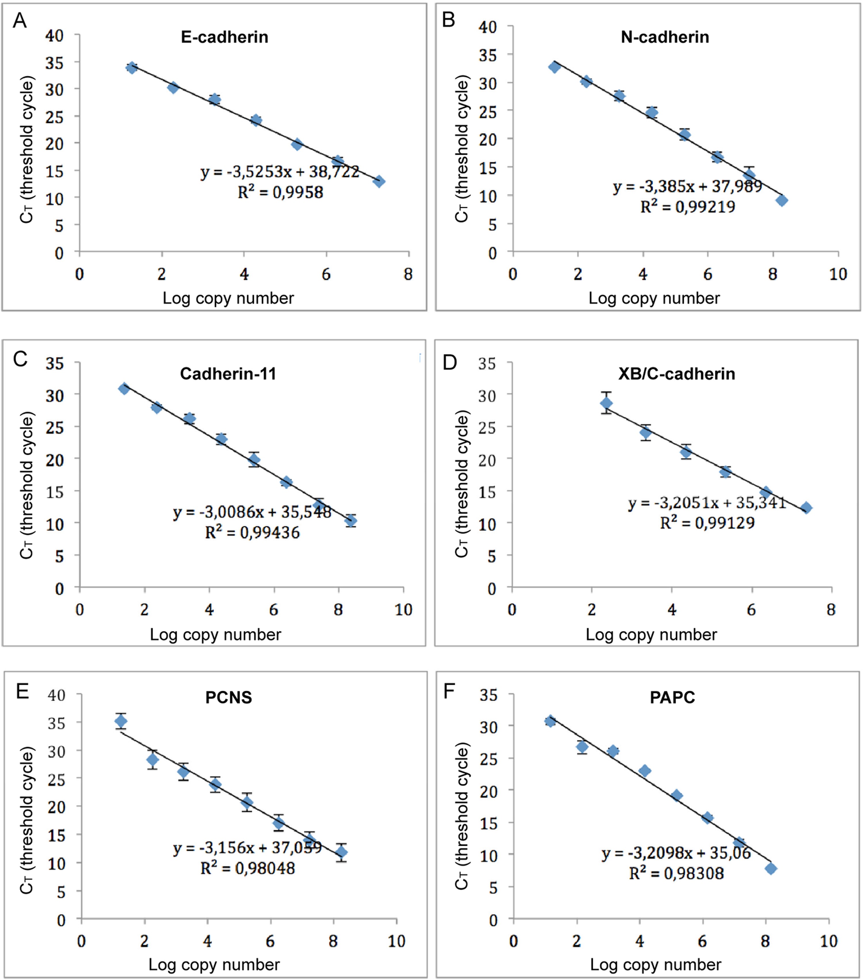 Standard curves for (A) E-cadherin, (B) N-cadherin, (C) Cadherin-11, (D) XB/C-cadherin, (E) PCNS and (F) PAPC, respectively. The standard curves were calculated with serial 10-fold dilutions of the plasmid DNA, ranging from 10 to 1 à 108 copies/μl. Each standard dilution was amplified by RT-qPCR using validated primers in triplicates. For each gene, the determined CT values were plotted against the logarithm of their calculated initial copy numbers. Independent serial dilutions of the standards were repeated at least three times for each dilution and the mean value with standard deviation is shown. A standard curve was generated by linear regression through the points representing the mean values. The equation for the regression line and the correlation coefficient (R2) are shown above the graph. The equation was used to determine the starting quantity of the test sample from the experimental CT values.