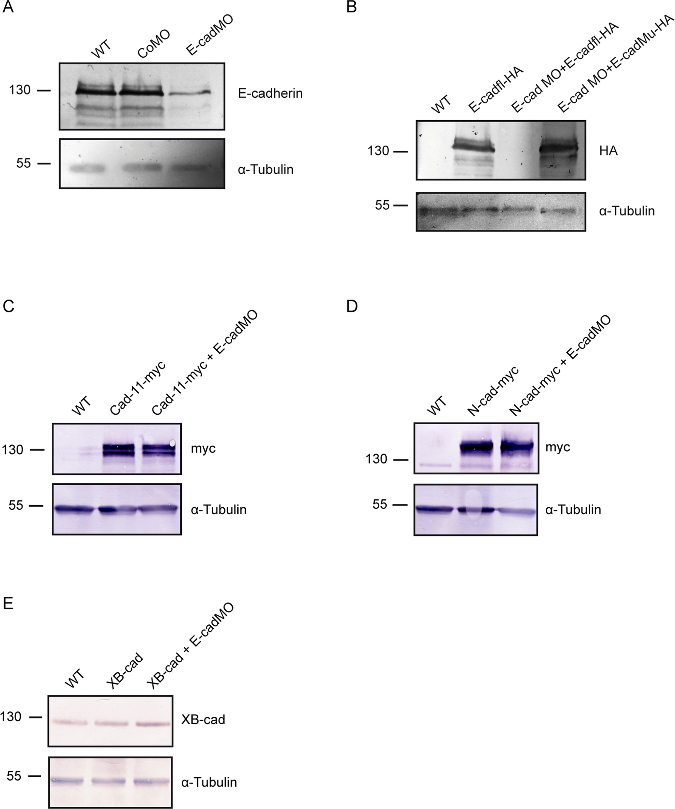 Embryos were injected with mRNA of unmutated full length E-cadherin with a HA-tag (E-cadfl-HA) alone or along with E-cadMO. Expression of the MO binding site mutated E-cadherin rescue construct (E-cadMu-HA) is not affected by E-cadMO co-injection. Expression of Cadherin-11 (C), N-cadherin (D) and XB-cadherin (E) are not affected in E-cadherin morphant embryos. Immunodetection was performed on cell lysates against the HA-tag, myc-tag, XB-cadherin and α-Tubulin. WT: uninjected wild type embryos. Anti-α-Tubulin was served as loading control.
