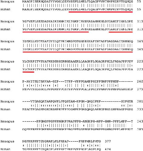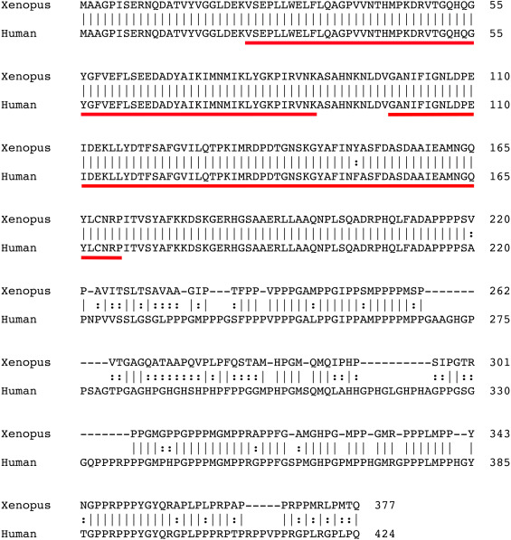 Fig. 1. Sequence and structure comparison of Xenopus and Human SF3B4. The predicted amino acid sequences from Xenopus laevis and human, SF3B4 were aligned using ClustalW. The two RNA recognition motifs (RRM) are underlined.