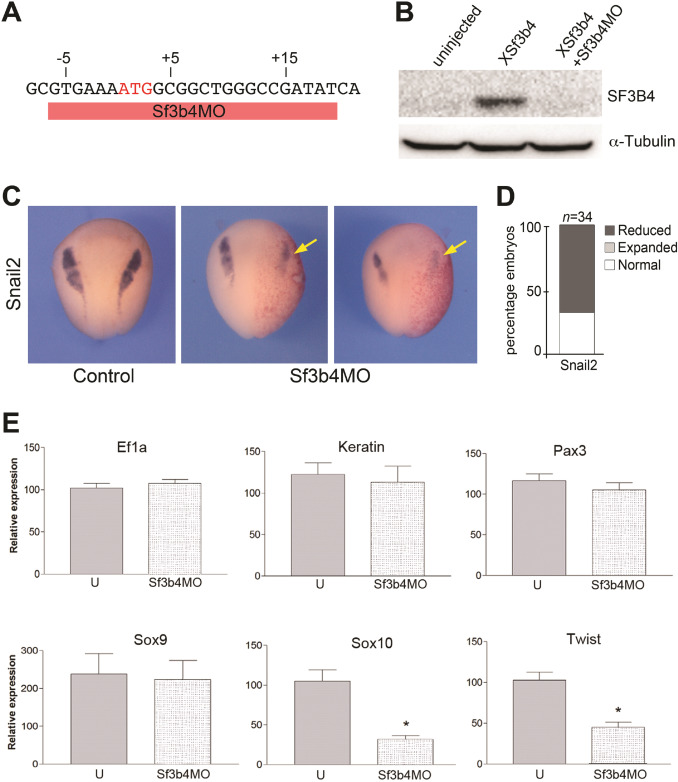 Fig. 3. Sf3b4MO, a translation blocking morpholino prevents snail2, sox10 and twist expression. (A) Design of the translation blocking morpholino antisense oligonucleotide. Sf3b4MO (red bar) targets the ATG start site of Xenopus Sf3b4 mRNA. (B) Western blot using lysates from embryos injected with XSf3b4 mRNA alone or in combination with Sf3b4MO, shows that Sf3b4MO blocks SF3B4 protein accumulation in vivo. α-tubulin is shown as a loading control. (C)Snail2 expression is reduced in Sf3b4MO-injected (40 ng) embryos (arrows). Dorsal views, anterior to top. The injected side (arrows) is indicated by the lineage tracer (Red-Gal). (D) The graph is a quantification of the results from three independent experiments. The number of embryos analyzed (n) is indicated on the top of the bar. (E) Gene expression analysis (qPCR) of control (U) and Sf3b4MO-injected embryos. Values are normalized to ef1α and presented as mean ± s.e.m.; (*) p < 0.002 (Studentâs t-test), from five independent samples.