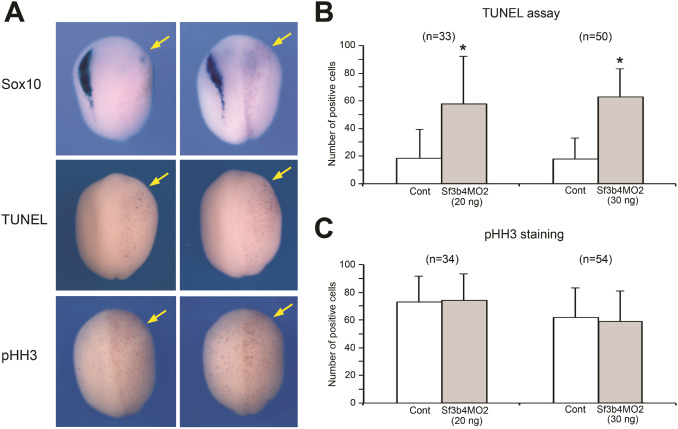 Fig. 5. Sf3b4 depletion results in increased cell-death in the ectoderm. (A)In situ hybridization of Sf3b4MO2-injected embryos (30 ng) at stage 15 showing loss of sox10 expression on the injected side (upper panels). Sf3b4MO2 injection significantly increases the number of TUNEL-positive cells (middle panels). Sf3b4MO2 injection does not affect the levels of cell proliferation as visualized by phosphohistone H3 (pHH3) immunostaining (lower panels). Dorsal views, anterior to top. The injected side (right) is indicated by the lineage tracer (Red-Gal; arrows). (B-C) Graph illustrating the quantification of the number of TUNEL-positive (B) and pHH3-positive (C) cells on the control (Cont) and injected sides in embryos that received unilateral injection of Sf3b4MO2 (20 ng or 30 ng as indicated). The number of embryos analyzed (n=) is indicated on the top of each graph. Values are presented as mean ± s.e.m.; (*) p-value <0.0001 (Studentâs t-test).