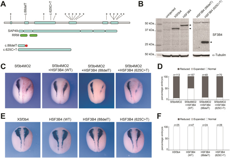 Fig. 6. Loss of Sox10 expression in Sf3b4-depleted embryos is rescued by human SF3B4. (A) Distribution of the 18 unique mutations in SF3B4 gene (*) that cause Nager syndrome (Bernier et al., 2012). Using site directed mutagenesis we generated two constructs that duplicate the human frameshift mutation in exon 2 (c.88delT) and a nonsense mutation in exon3 (c.625C>T). Domain structure of SF3B4/SAP49 (blue boxes) is indicated with the position of the RRMs (green boxes). The predicted translational effect of the two SF3B4 mutations used in this study is shown. The red bar indicates altered amino acid sequence. Modified from Bernier et al., 2012. (B) Western blot using lysate from embryos injected with 2 ng of Xsf3b4, HSF3B4, 88delT or 625C>T mRNAs. α-tubulin is shown as a loading control. 88delT mRNA is expected to generate a short product (~4.0 kDa) not recognized by Sf3b4 antibody. (C) Wild-type (WT) HSF3B4 restore sox10 expression in Sf3b4-depleted embryos, while the mutated mRNAs are unable to do so. Dorsal views, anterior to top. The injected side (right) is indicated by the lineage tracer (Red-Gal). (D) The graph is a quantification of the results from four independent experiments. The number of embryos analyzed (n) is indicated on the top of each bar. (E) Injections of Xsf3b4, HSF3B4 mRNAs and its mutated versions had no effect on sox10 expression. Dorsal views, anterior to top. The injected side (right) is indicated by the lineage tracer (Red-Gal). (F) The graph is a quantification of the results. The number of embryos analyzed (n) is indicated on the top of each bar.