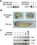 Fig. 4. Inhibition of normal head and axis formation by depletion of endogenous xCyp26c. Morpholino activity was confirmed by Western blot. (B) Embryos injected with 40 ng of MO-xCyp26c did not have head structures and had short axis formation. (C) xCyp26c was injected with DNBR and animal caps were cultured to stage 24. Expression patterns of Otx2 and HoxB9 were analyzed by RT-PCR.