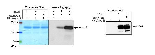 GST-hGwl and GST-GwlK72M were mixed with 20 µl of phosphorylation mix, 1µg of