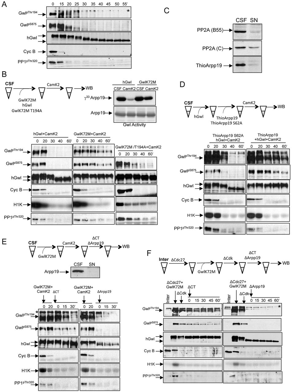 Preventing PP2A-B55 reactivation upon meiotic and mitotic exit promotes a substantial delay of the phosphorylation of Gwl on Thr194. (A) 20 µl of CSF extracts were supplemented with wild-type Gwl recombinant kinase (hGwl; 1 µg). After 20 min, extracts were supplemented with CamK2, and samples were recovered at the indicated timepoints to study the dephosphorylation of Gwl on Ser875 (GwlpSer875) and Thr194 (GwlpThr194) with phospho-specific antibodies. Cyclin B (cyc B) stability, phosphorylation of PP1 on Thr320 (PP1pThr320) and levels of the ectopic human Gwl forms (hGwl) are also shown. (B) 20 µl of CSF extracts were supplemented with either wild-type (hGwl) or GwlK72M recombinant proteins (1 µg), or with 5 µl of CSF extracts in which the mRNA of the GwlK72M T194A double mutant had been translated. After CamK2 addition, samples were taken to check dephosphorylation of Gwl on Ser875 and Thr194, cyclin B stability, cyclin-B–Cdk1 activity, phosphorylation of PP1 on Thr320 and the levels of the ectopic human Gwl. The activity of ectopic human Gwl (γ33Arpp19) was measured as indicated in Materials and Methods in CSF extracts that had been supplemented with hGwl or GwlK72M 60 min after CamK2 addition. (C) 2 µg of Thio-phosphorylated His–Arpp19 was added to 20 µl of CSF extracts and, after 20 min of incubation, ThioArpp19 was recovered by His-tag pull down. The levels of Arpp19 (ThioArpp19) and the PP2A B55 [PP2A (B55)] and C [PP2A(C)] subunits left in the supernatant were assessed by western blotting (WB). SN, supernatant. (D) The experiment described in A except that Thio-phosphorylated His–Arpp19 (2 μg for 20 μl of CSF extracts) instead of GwlK72M was added. (E) CSF extracts were supplemented with GwlK72M and CamK2, and submitted to a control depletion (ΔCT) or depletion of Arpp19 (ΔArpp19). Phosphorylation of the indicated residues of Gwl was analysed, as well as the ectopic Gwl levels, cyclin B degradation and cyclin-B–Cdk1 activity (H1K). Efficacy of Arpp19 depletion is shown. (F) Interphase extracts were devoid of Cdc27 (ΔCdc17; by immunodepletion) and induced to enter into mitosis by GwlK72M addition. After 40 min, extracts were first forced to exit mitosis by Cdk1 depletion and were subsequently depleted of Arpp19 (or not) by immunoprecipitation. Phosphorylation on Ser875 and Thr194 of Gwl, and on Thr320 of PP1, as well as ectopic GwlK72M and cyclin B levels and cyclin-B–Cdk1 activity are shown. Asterisks denote non-specific bands recognised by the antibodies. Inter, interphase.
