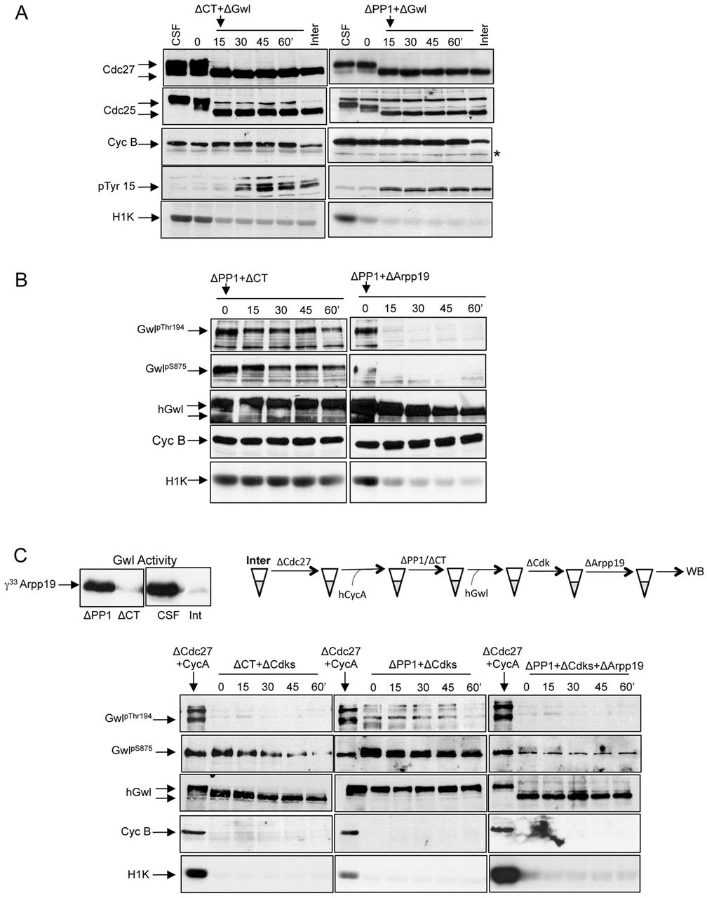 PP1 is also involved in dephosphorylation of Ser875 on Gwl upon mitotic exit. (A) CSF extracts were first immunoprecipitated with anti-PP1 (ΔPP1) antibodies or with control (ΔCT) antibodies, and subsequently depleted of Gwl (ΔGwl). The phosphorylation of Cdc27, Cdc25, Tyr15 of Cdk1 (pTyr 15) and the levels of cyclin B (cyc B) and of H1K activity were monitored by western blotting (WB). (B) CSF extracts were depleted of PP1 and subsequently submitted to a control or Arpp19 (ΔArpp19) depletion. The phosphorylation of the two activating sites of Gwl, as well as the levels of ectopic Gwl, cyclin B and the activity of cyclin-B–Cdk1 (H1K) are shown. (C) Interphase extracts were depleted of Cdc27 and subsequently forced to enter into mitosis by the addition of cyclin A (hCycA). Extracts were then depleted (or not) of PP1, supplemented with hGwl and forced to exit mitosis by immunoprecipitation of Cdks (ΔCdks). Some of the PP1- and Cdk-depleted extract was subsequently depleted of Arpp19, and the phosphorylation on the different residues of Gwl, and the ectopic Gwl levels, cyclin B stability and H1K activity, were measured. hGwl activity was measured in extracts that had been depleted (or not) of PP1 60 min after Cdks immunoprecipitation and was compared to that obtained in CSF and interphase extracts that had been supplemented with the same amount of this ectopic kinase. Asterisks denote non-specific bands recognised by the antibodies. Int, Inter, interphase egg extracts.