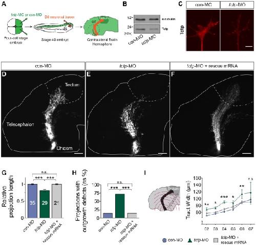 Fig. 2. Tctp is required to establish correct retinotectal projections in vivo. (A) Experimental outline. OT, optic tract. Dashed line encircles the contralateral, DiI-filled eye. (B) tctp-MO leads to a specific knockdown in Tctp protein levels in the CNS, as evaluated by western blot analysis of stage 37/38 embryos using an anti-Tctp antibody. (C) Representative growth cones from control morpholino (con-MO)-injected and tctp-MO-injected embryos stained for Tctp. (D-F) DiI-filled retinotectal projections in MO-injected stage 40 embryos. Dashed lines approximate the boundary of the optic tectum, where RGC axons terminate. Injection of MO-resistant tctp mRNA (rescue mRNA) rescued the development of the retinotectal projection. (G) Relative projection lengths in the various MO-injected backgrounds. Mean±s.e.m.; n, number of brains analysed; ***P<0.0001, Kruskal–Wallis test. (H) Number of embryos displaying axon extension defects. con-MO versus tctp-MO, P<0.0001; tctp-MO versus tctp-MO+rescue mRNA, P=0.0002; Fisher's exact test; performed on number of observations but plotted as percentages. (I) Mean (±s.e.m.) optic tract widths. con-MO versus tctp-MO, **P<0.01 (C2), *P<0.05 (C3), ***P<0.0001 (C4), *P<0.05 (C5), **P<0.05 (C6), two-way ANOVA with Bonferroni correction (for details of statistics see Fig. S2F). C2-7 denote imaginary, evenly spaced hemi-circumferences centred on the optic chiasm. Scale bars: 5 μm in C; 100 μm in D-F. n.s., not significant. |