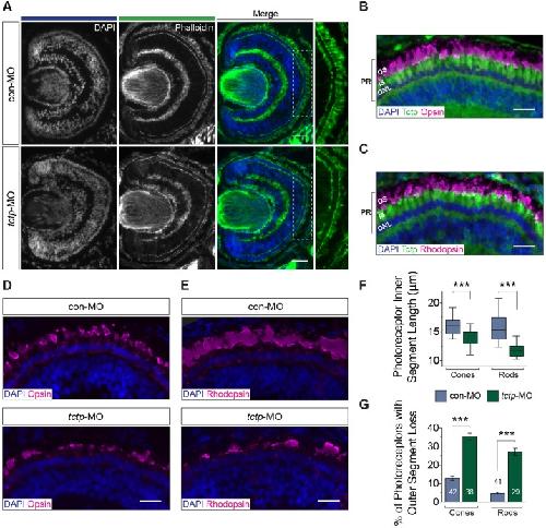 Fig. 3. Tctp is not necessary for the timely development of the eye. (A) Representative stage 43 control and Tctp-depleted retinas stained with phalloidin and DAPI. The boxed areas are shown at a higher magnification to the right. (B,C) Immunohistochemistry analysis of the photoreceptor layer in stage 43 wild-type retinas probed with anti-Tctp and anti-opsin or anti-rhodopsin antibodies, and counterstained with DAPI. IS, photoreceptor inner segment; ONL, outer nuclear layer; OS, photoreceptor outer segment; PR, photoreceptor. (D,E) Representative micrographs of the photoreceptor layer in stage 43 control or Tctp morphant retinas probed with anti-opsin or anti-rhodopsin antibodies, and counterstained with DAPI. (F) Average inner segment lengths in control and Tctp morphant retinas. ***P<0.0001, unpaired t-test; box plot whiskers denote 5th-95th percentile. (G) Proportion of photoreceptors showing a complete loss of the outer segment in control and Tctp morphant retinas. n, number of photoreceptor layers analysed; ***P<0.0001, unpaired t-test. Scale bars: 50 μm in A; 25 μm in B-E. |