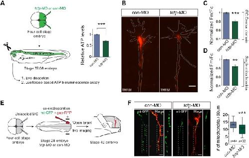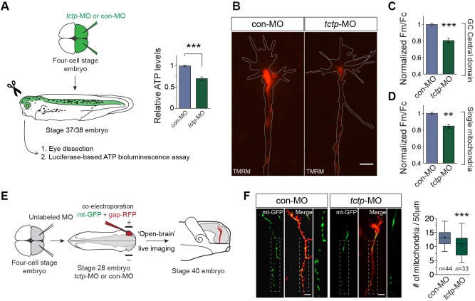 Fig. 6. Compromised mitochondrial homeostasis in axons deficient for Tctp. (A) Relative ATP levels per retina normalised to total protein. Mean±s.e.m.; n=17 per condition, ***P<0.0001, unpaired t-test. (B) Representative RGC growth cones loaded with TMRM from con-MO-injected and tctp-MO-injected embryos. (C) Quantification of TMRM fluorescence intensity in the mitochondria-rich growth cone (GC) central domain. Mean±s.e.m.; ***P=0.0002, Mann–Whitney test. (D) Quantification of TMRM fluorescence intensity of individual mitochondria along the axonal compartment. Mean±s.e.m.; **P<0.0012, Mann–Whitney test. Up to ten replicate experiments were performed per condition, totalling 427 growth cones and 4918 single mitochondria analysed. (E) Schematic of the approach used to examine mitochondrial density in RGC axons in vivo. (F) Micrographs of RGC axons co-labelled with mt-GFP and gap-RFP, plus quantification of axonal mitochondrial density. n, number of axons analysed; ***P=0.0002, unpaired t-test. In box plots, whiskers cover 5th-95th percentile and ‘+’ indicates the mean. Boxed areas in images are enlarged to the right. Scale bars: 5 μm. |