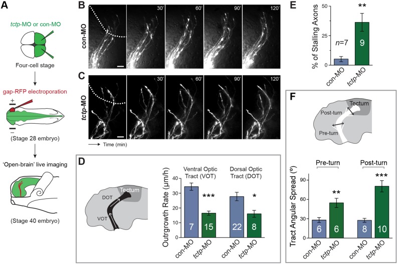 Fig. 4. Tctp deficiency impairs axon extension in vivo. (A) Schematic of the experiment. con-MO-injected or tctp-MO-injected stage 28 embryos were electroporated with gap-RFP to label retinal axons and allowed to develop until stage 40 before in vivo brain imaging. (B,C) Representative time-lapse images of gap-RFP-labelled control (top) and Tctp-depleted (bottom) RGC axons coursing through the optic tract. Dotted lines approximate the boundary of the optic tectum. (D) Average extension rates measured from time-lapse recordings of RGC axons coursing through the ventral optic tract (VOT) and dorsal optic tract (DOT) in controls and Tctp morphants. VOT, ***P<0.0001; DOT, *P<0.0273. (E) Percentage of axons with stalled progression in the control and morphant backgrounds. **P<0.0035. (F) Retinotectal projection angular spreads in controls and Tctp morphants. Pre-turn, **P<0.0082; post-turn, ***P<0.0001. (D-F) Mean±s.e.m.; n, number of axons (D) or embryos (E,F) analysed; unpaired t-test. Scale bars: 25 μm. |