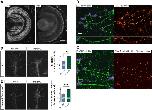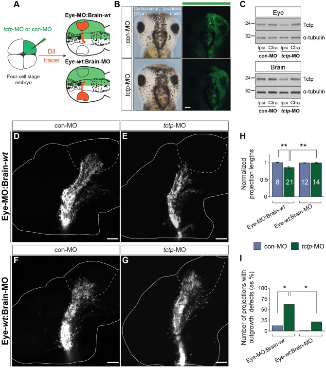 Fig. 5. The retinotectal projection develops unerringly in Tctp-deficient brains. (A) Experimental outline illustrating the two experimental scenarios created to investigate the contribution of extracellular Tctp to the optic tract pathway substrate. (B) Dorsal view of embryos microinjected unilaterally with fluorescein-tagged con-MO or tctp-MO. (C) Unilateral tctp-MO injection leads to a targeted knockdown in Tctp expression in half of the CNS, as shown by immunoblot analysis of eye or brain lysates. The ‘ipsilateral’ label refers to the MO-injected half of the embryo; the uninjected half is designated ‘contralateral’. (D-G) DiI-filled stage 40 retinotectal projections. Dashed lines approximate the boundary of the optic tectum. (H) Relative projection lengths. Mean±s.e.m.; n, number of brains analysed; **P=0.0002, Kruskal–Wallis and Dunn's multiple comparison test (for details of statistics see Fig. S2F). (I) Number of brains displaying axon extension defects. Eye-MO:Brain-wt backgrounds, *P=0.0352; tctp-MO backgrounds, *P=0.0364; Fisher's exact test; analyses performed on frequencies but plotted as percentage. Scale bars: 100 μm. |