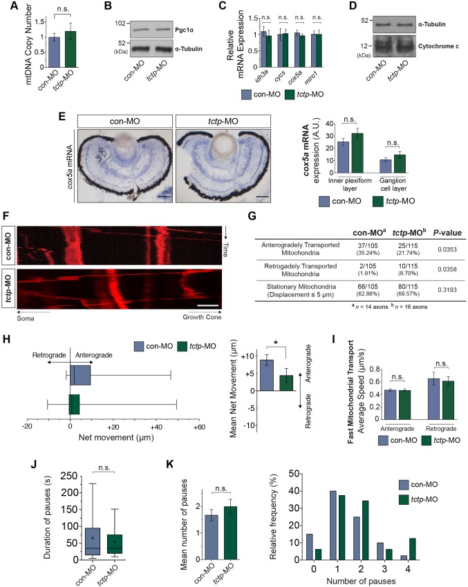 Fig. 7. Altered mitochondrial dynamics in Tctp-depleted axons. (A) Ratio of mitochondrial to nuclear DNA determined by qPCR in control and Tctp-depleted retinas. Mean±95% confidence interval; n=7 paired retinas per condition; P=0.23, Mann–Whitney test. (B) Tctp morphants show unaltered Pgc1α expression levels in the CNS as evaluated by western blot analysis of stage 37/38 embryos using an anti-Pgc1α antibody. n=3 independent samples; P=0.5955, unpaired t-test. (C) Tctp morphants show unaltered expression of mitochondria-related genes as assessed by RT-qPCR using eye RNA extracts. Mean±95% confidence interval; n=9 retinas per condition, Mann–Whitney test. (D) Tctp morphants show unaltered cytochrome c expression levels in the CNS, as evaluated by western blot analysis of stage 37/38 embryos using an anti-cytochrome c antibody. n=3 independent samples; P=0.5989, unpaired t-test. (E) Control and Tctp-depleted RGCs have similar levels of cox5a expression. Mean±s.e.m.; n=∼20. GCL, P=0.2026; IPL, P=0.2668; Mann–Whitney test. (F) Representative kymographs (time-space plots) of MitoTracker-labelled RGC axonal mitochondria in control and Tctp morphant backgrounds. The vertical and horizontal axes represent time and spatial position, respectively (e.g. a vertical line indicates a stationary mitochondrion). (G) Summary of changes in axonal mitochondrial dynamics (statistical significance determined using Fisher's exact test). (H) Relative mitochondrial motility and mean net movement in control and Tctp-depleted RGC axons. Box plot whiskers indicate 5th-95th percentile. Right: Mean±s.e.m.; *P<0.0117, Mann–Whitney test. (I) Analysis of fast mitochondrial transport. Mean±s.e.m.; anterograde direction, P=0.9468; retrograde direction, P=0.7308; Mann–Whitney test. (J) Average duration of mitochondrial pauses in control and Tctp-depleted RGC axons. Box plot whiskers indicate 5-95 percentile and ‘+’ the mean; P=0.902, Mann–Whitney test. Permanently stationary mitochondria were excluded from this analysis. (K) Average number and frequency distributions of mitochondrial pauses. Mean±s.e.m.; P=0.317, Mann–Whitney test. Scale bars: 50 μm in E; 5 μm in F. n.s., not significant. |