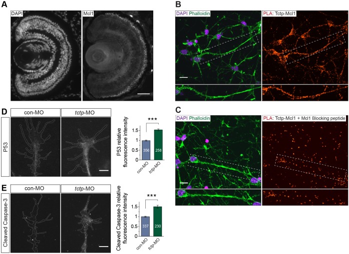 Fig. 8. Axonal Tctp interacts with pro-survival Mcl1. (A) Coronal section of stage 43 retina probed with an anti-Mcl1 antibody and counterstained with DAPI. (B,C) PLA signal for Tctp and Mcl1 in cultured rat cortical neurons (E18.5+3 DIV) counterstained with DAPI and phalloidin. The boxed areas are enlarged beneath. In C, anti-Mcl1 serum and blocking peptide were co-incubated before proceeding with the assay. (D) Representative control and Tctp morphant RGC growth cones stained for P53. Mean±s.e.m.; n, number of growth cones analysed; ***P=0.0002, unpaired t-test. (E) Representative control and Tctp morphant RGC growth cones stained with an antibody that specifically recognises the cleaved (activated) form of Caspase-3. Mean±s.e.m.; n, number of growth cones analysed; ***P=0.0002, unpaired t-test. Scale bars: 50 μm in A; 10 μm in B,C; 5 μm in D,E. |