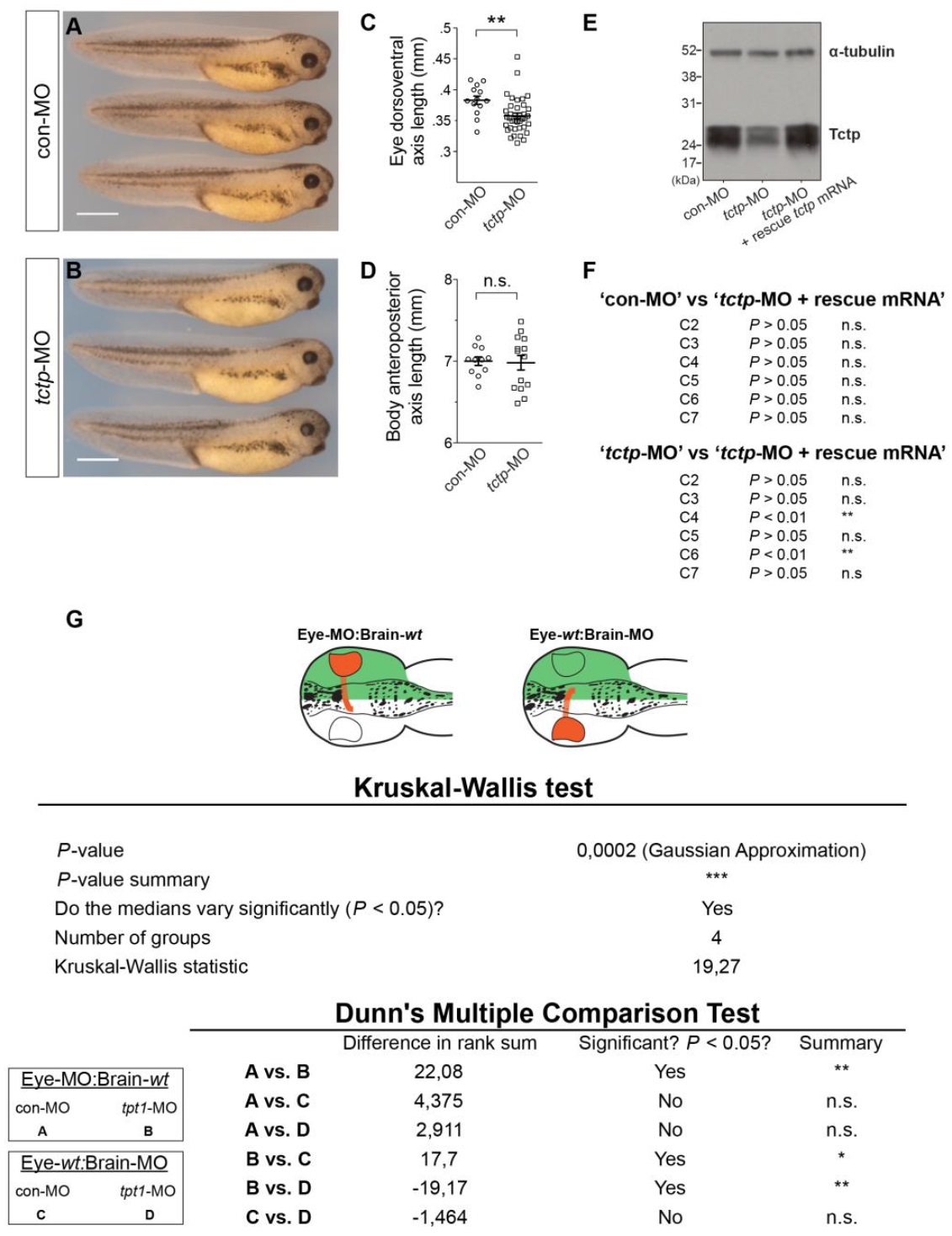 Figure S2. Morphological characterization of Tctp knockdowns. (A and B) Micrographs of stage 39 con-MO- or tctp-MO-injected embryos. Albeit with smaller eyes, Tctp morphants appear morphologically normal, and their development progresses at comparable rates relative to con-MO-injected tadpoles. (C) Plot of eye size measurements (mean ± SEM; ** P < 0.0063, unpaired t-test). (D) Plot of body length (anteroposterior axis) measurements (mean ± SEM; n.s. P < 0.8614, unpaired t-test). (E) The normalization of Tctp protein expression levels was evaluated by Western blot after a morpholino-resistant tctp transgene was co-injected with tctp-MO. Protein extracts were prepared from stage 37/38 embryos. (F) Complements Fig. 2I: Summary of the statistical analysis examining the effect of normalizing Tctp expression levels on the development of Tctp-depleted projections. (G) Complements Fig. 3D-H: Summary of the statistical analysis performed to evaluate the impact of Tctp deficiency on the length of the retinotectal projection. Scale bars: 110 μm. |