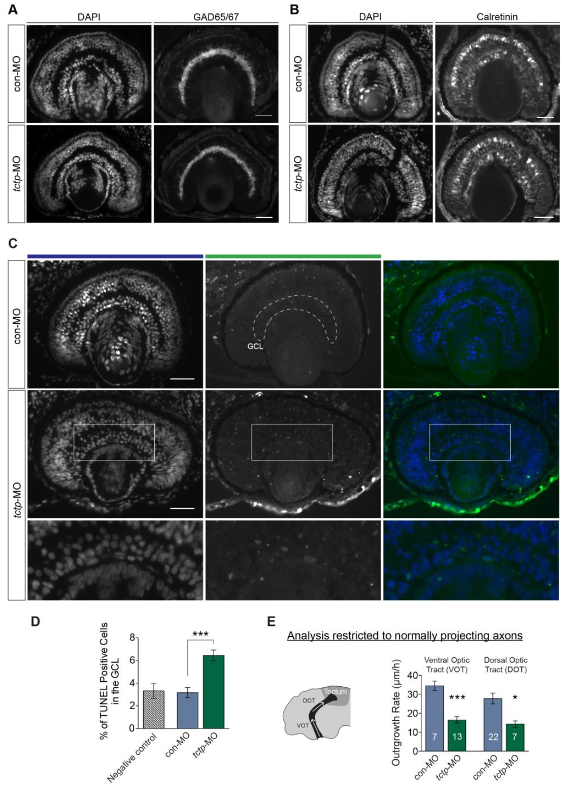 Figure S3. Tctp deficiency impairs axon extension in vivo. (A and B) Coronal sections of stage 43 control or Tctp-depleted retinas probed for Glutamate decarboxylase (GAD65/67) and Calretinin, two cell-type-specific markers (GAD65/67 and Calretinin antisera detect GABAergic amacrine cells, and retinal ganglion cell/bipolar cells, respectively). (C and D) TUNEL staining on stage 43 control or Tctp-depleted retinas. The number of TUNEL-positive cells in the ganglion cell layer was found to be increased in Tctp morphants (mean ± SEM; n > 30 embryos for both backgrounds; *** P < 0.0001, unpaired t-test). (GCL: ganglion cell layer, approximated by the dashed outline). The boxed areas are shown at a higher amplification in the bottom panels. (E) Plot showing the average extension rates measured from time-lapse recordings of RGC axons coursing normally (i.e. without guidance errors) through the ventral optic tract (VOT) and dorsal optic tract (DOT) in controls and Tctp morphants (mean ± SEM; n = no. of axons analysed; VOT: *** P < 0.0001, unpaired t-test; DOT: * P < 0.0159, unpaired t-test). Scale bars: 50 μm. |