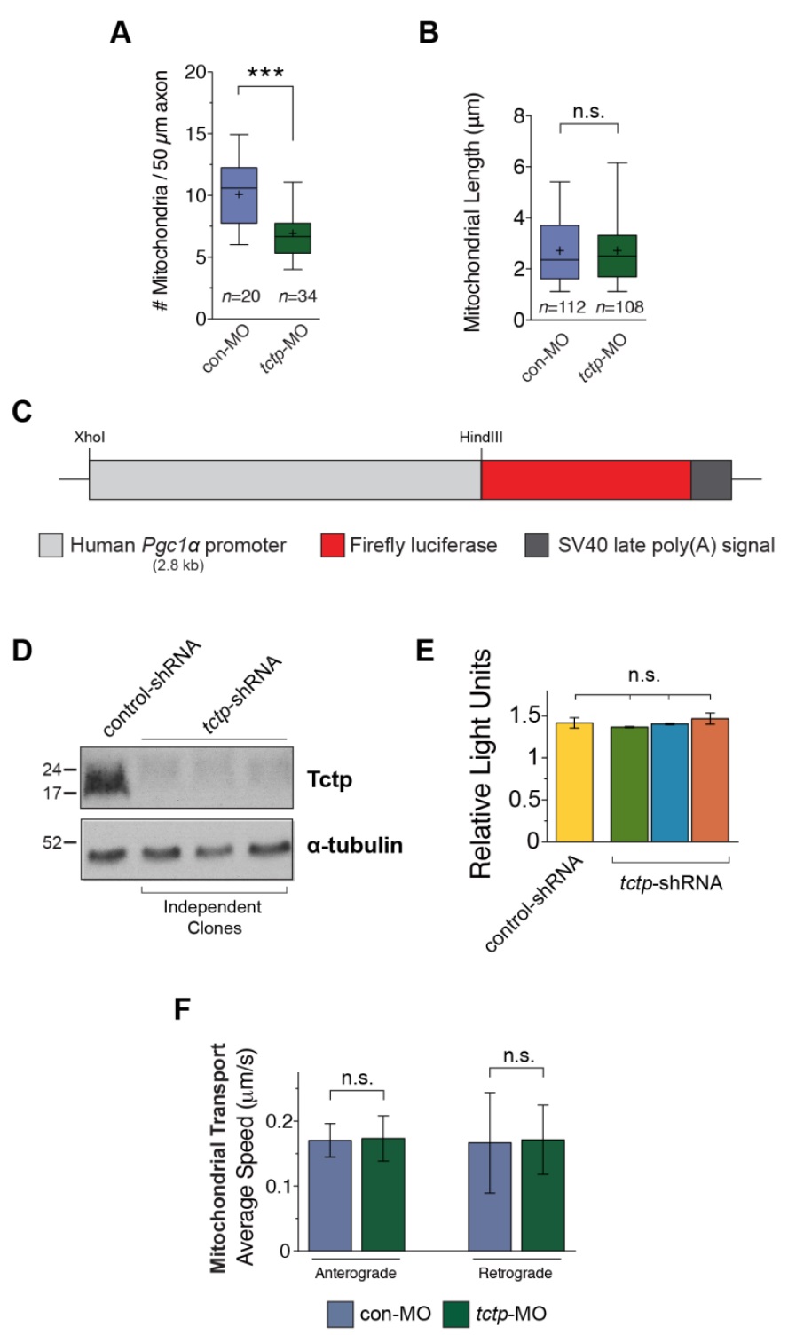 Figure S4. Tctp knockdown compromises axonal mitochondrial function. (A) Stage 32 control and Tctp morphant eye explants were grown in vitro for 24 hours and incubated with MitoTracker to visualize mitochondria. The plot shown here represents the average number of axonal mitochondria found in con-MO- or tctp-MO-positive retinal ganglion cells (boxplot: whiskers cover 5-95 percentile, ‘+’ denotes the mean value; n = no. of axons analysed; *** P < 0.0001, Mann-Whitney test). (B) Plot of axonal mitochondrial length in control and Tctp-depleted retinal ganglion cells (boxplot: whiskers cover 5-95 percentile, ‘+’ denotes the mean value; n = no. of axons analysed; n.s., P = 0.7960, Mann-Whitney test). (C-E) Normal pgc1a expression in HCT116 cells deficient for Tctp. The rational for applying this seemingly indirect approach is not immediate. We knew a priori that basal P53 levels were elevated in tctp+/- mice (Amson et al., 2012) and that the expression of pgc1a was repressed by the activation of P53 in the context of telomere dysfunction (Sahin et al., 2011). Since the mitochondrial traits identified in Tctp morphants were reminiscent of dysfunctional Pgc1α activity (Wareski et al., 2009), we hypothesised that the activation of P53 in Tctp-deficient backgrounds could result in mitochondrial dysfunction due to its repression of pgc1a expression. Hence the strategy used here, for it allowed us to evaluate the expression of pgc1a at the transcriptional level. (C) The promoter region of human pgc1a (2.8 kb) was cloned upstream of the luciferase gene cassette and stably transfected into tctp or control shRNA-infected HCT116 cells. Subsequently, lysates of tctp or control shRNA-infected HCT116 cells were run on a SDS-PAGE gel and Tctp protein expression verified by western blot. Tctp expression knockdown was as high as 85% in these cells (D). We show in (E) a plot of the average relative light units (RLU) measured in cells co-transfected with pgc1a-luc and a control plasmid (mean ± SEM; six biological replicates of tctp-shRNA-infected cells were measured in triplicate in the two independent rounds of experiments conducted; *** P = 0.5544, one-way ANOVA). (F) Quantitative analysis of mitochondrial transport velocities. Population-wide study of mitochondrial velocities (excluding stationary organelles) suggests that no significant differences exist between control and Tctp-depleted axons, in agreement with the dataset shown in Fig. 7I (mean ± s.e.m.; anterograde direction: n.s., P = 0.9941; retrograde direction: n.s., P = 0.9371; statistical analyses used Mann-Whitney test). |