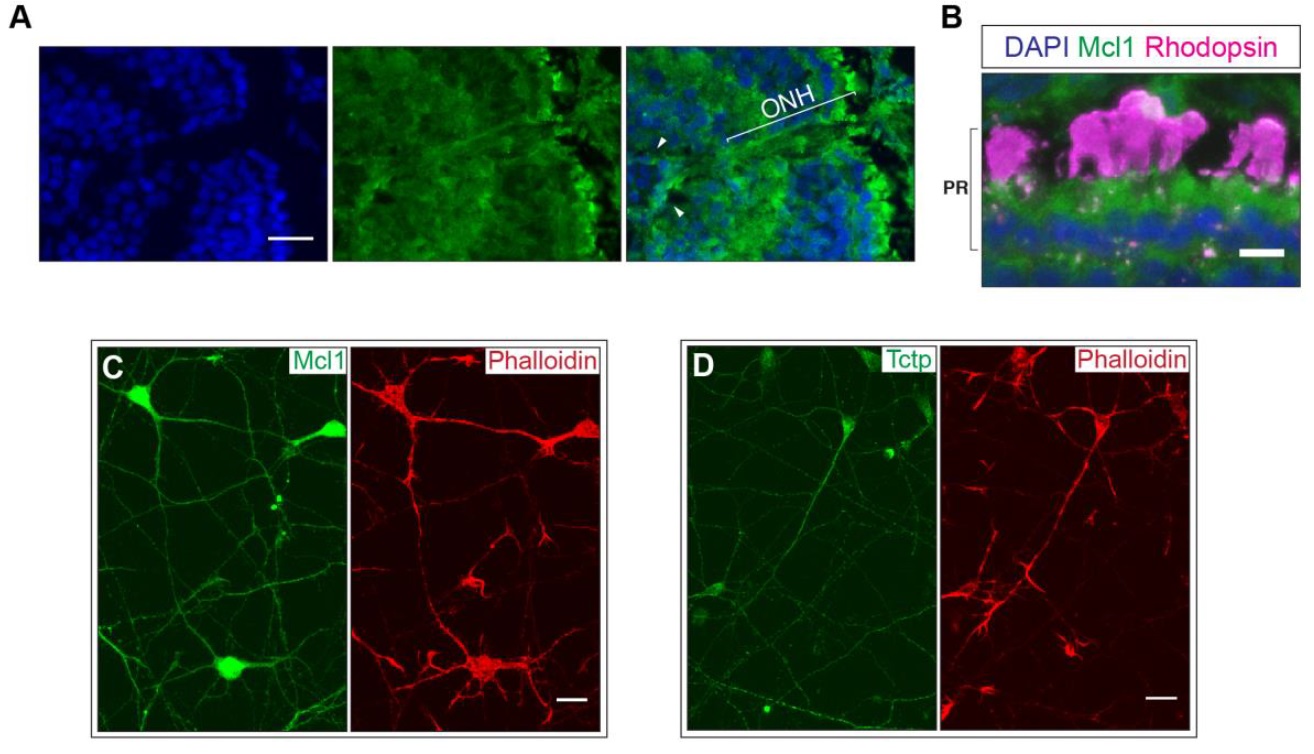 Figure S5. Pro-survival Mcl1 is expressed in the axonal compartment. (A) Complements Fig. 8A: Optic nerve head (ONH) region of a stage 43 wild-type retina (coronal section) probed for Mcl1 and counterstained with DAPI. Mcl1 was detected in the optic fiber layer and the optic nerve head, indicating that, like Tctp, this protein localizes to retinal ganglion cell axons in vivo. (B) Complements Fig. 8A: Outer nuclear layer of a stage 43 wild-type retina (coronal section) probed for Mcl1 and Rhodopsin, and counterstained with DAPI. Similar to Tctp, Mcl1 was detected in the inner segment of photoreceptors. (C and D) Cultured rat cortical neurons (E18.5 + 3DIV) stained for Mcl1 or Tctp, and counterstained with Phalloidin. Scale bars: 25 μm in (A), (C) and (D), 10 μm in (B). |