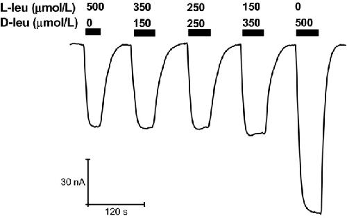 Figure 3. Mole fraction behavior of L‐leu and D‐leu. Mixtures containing variable proportions of L‐ and D‐leucine were applied while keeping constant the total concentration. The substantial constancy of the responses to mixtures containing L‐leucine indicates that this amino acid dominates the transport process by virtue of a higher apparent affinity. The larger current induced by D‐leucine alone is consistent with a higher turnover rate related to a lower affinity. Normalizing the transport current values to that recorded in 500 μmol/L of L‐leucine alone, the current in the presence of 350 μmol/L L‐Leu+150 μmol/L D‐Leu increases to 1.0769 ± 0.01566, when 250 μmol/L of both were perfused becomes 1.13986 ± 0.05827 and when 150 μmol/L L‐Leu and 350 μmol/L D‐Leu was tested the current is 1.20799 ± 0.03927.When 500 μmol/L D‐leucine is applied alone, it becomes from 2 to 4 times larger (mean 2.54265 ± 0.52057) data were collected from 10 oocytes of three different batches. |