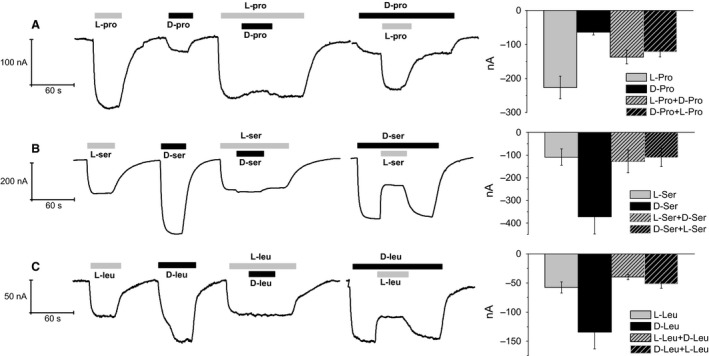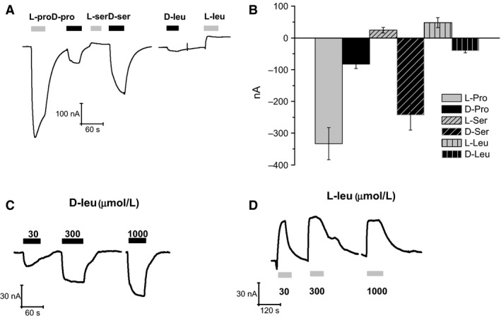 Figure 8. Action of different L‐ and D‐amino acids on the CAATCH1 transport currents in Na+. (A and B) L‐proline is more potent than the D‐form in eliciting the transport current; L‐serine and L‐leucine generate an apparent outward current, while their corresponding D‐forms produce an inward current. (A) a representative recording; (B) mean current ± SEM from 6 to 11 oocytes from two different batches. (C) application of increasing concentrations of D‐leucine produces progressively larger inward currents, whereas the same concentrations of L‐leucine produce an apparent outward current of constant size (D), consistent with a high‐affinity block of the transporter leak current (Miszner et al. 2007). |