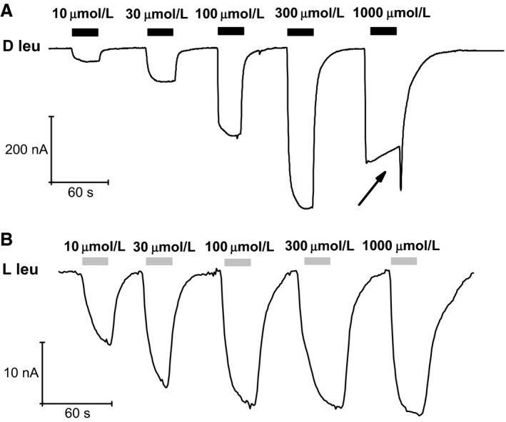 Figure 2. Leucine dose‐response in Na+. (A) the transport currents elicited by increasing amounts of D‐leucine show a progressive growth up to 300 μmol/L, but a further increase to 1 mmol/L produces an abrupt change in behavior exhibiting a reduction of the maximum attained value, an inactivation process and a peculiar inward transient surge at washout (arrow). (B) the same amounts of L‐leucine induce progressively larger responses showing saturation above 100 μmol/L without any anomalous behavior. |
