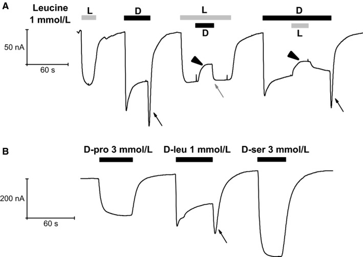 Figure 4. Effects of D‐leucine at 1 mmol/L. (A) when used at 1 mmol/L D‐leucine produces currents with peculiar behavior. A marked decline follows the large and fast initial current during exposure to the substrate and, quite notably, an inward surge of current develops when the substrate is removed (arrows). Note that the surge is not present when the removal of D‐leucine occurs in the presence of L‐leucine (gray arrow). Furthermore, the simultaneous presence of both enantiomers causes a reduction of the current generated by either of the two when applied alone (black arrowheads). (B) subsequent application of the D‐forms of proline, leucine, and serine on the same oocyte shows the specificity of the D‐leucine response. |