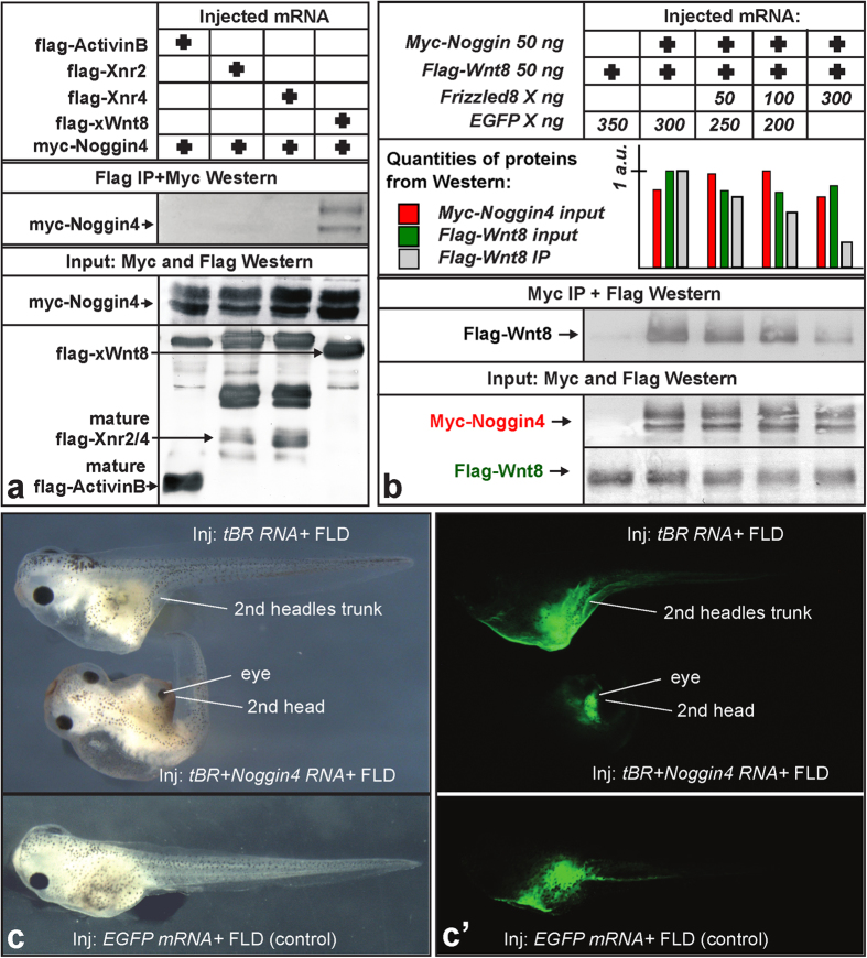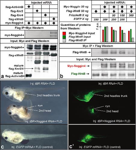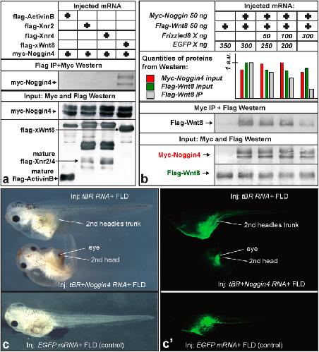 Figure 2: Noggin4 binds and antagonises Wnt8. (a) Analysis of Noggin4 interactions with ActivinB, Xnr2, Xnr4 and XWnt8 by CoIP assay. (b) Frizzled8 competes with Noggin4 for Wnt8 binding in the CoIP assay. Embryos were injected at the 2-cell stage with Noggin4 and Wnt8 mRNA or with these mRNAs mixed with increasing amounts of Frizzled8 mRNA as indicated. CoIP was conducted using crude extracts of the mid-gastrula embryos as described by52. See Methods section for the method of WB quantification. (c) Induction of a secondary head with a cyclopic eye by co-injection of Noggin4 and tBR mRNA (60%, nâ=â70). tBR mRNA injected alone induces only a secondary trunk (80%, nâ=â70). No secondary axes were observed in the control embryos injected by EGFP mRNA (100%, nâ=â60). (câ) Location of co-injected Fluorescein-Lysin-Dextran (FLD) in tadpoles shown in (c). |