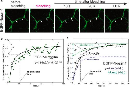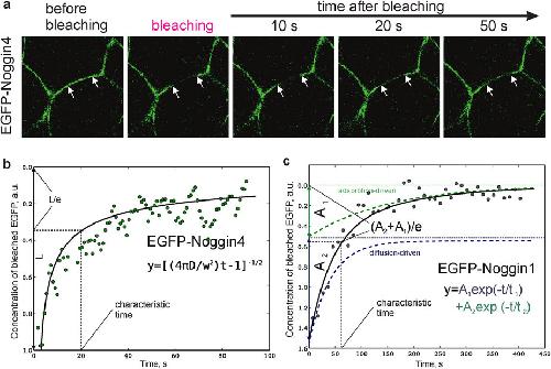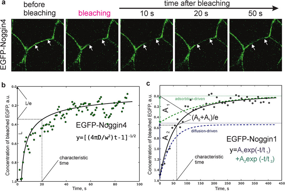 Figure 4: Analysis of Noggins and Wnt8 diffusivity. (a) Representative snapshot images of the photobleaching procedure of EGFP-Noggin4 in IS. Arrows indicate the margins of the bleached region. Snapshots for other studied proteins are presented at Fig. S9. Representative examples of EGFP-Noggin4 (b) and EGFP-Noggin1 (c) FRAP kinetics in single zones of the ectodermal IS. Equations and curves that fit the obtained data sets are shown under the curves. |