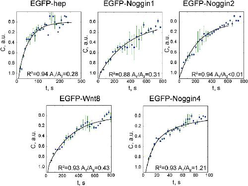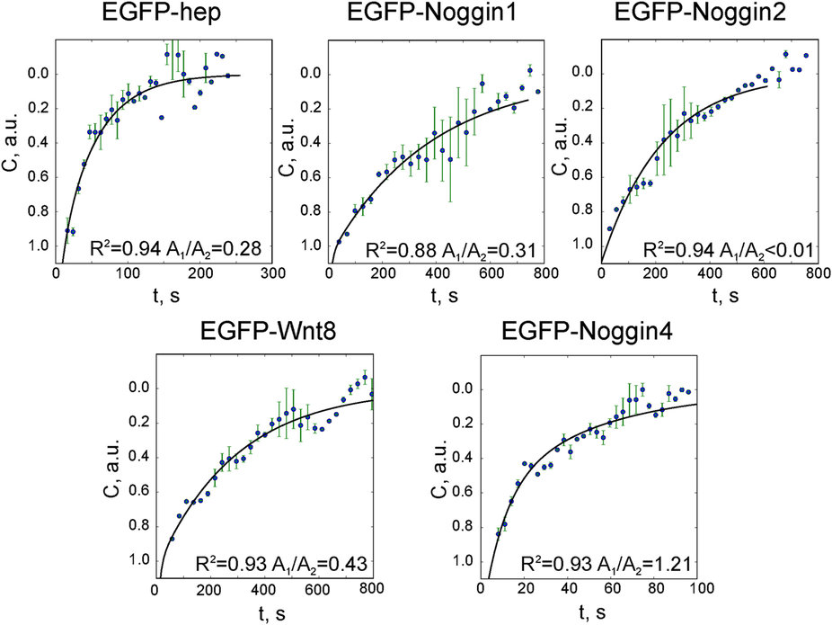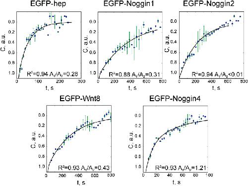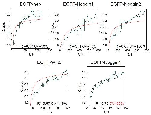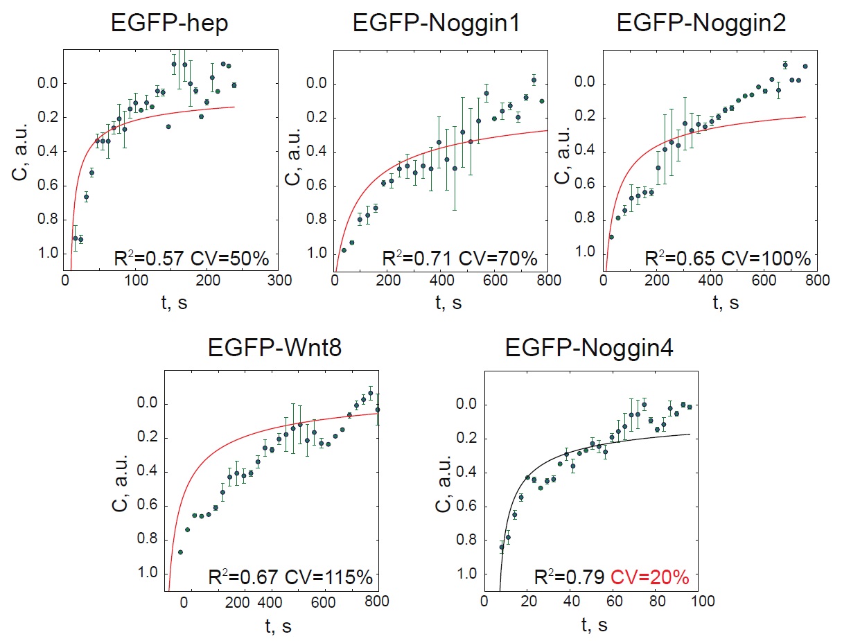 Figure S10. FRAP data fitted to the equation (S1.2). Averaged normalised data with error bars and approximation curves are plotted for every experiment. The determination coefficient (R2) is presented for every group of observations. The lowest coefficient of variation (CV) of parameter D calculated for every separate measurement was observed for EGFP-Noggin4. |