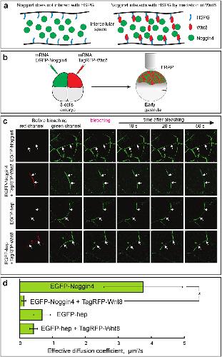 Figure 6: Investigation of Noggin4 interaction with Wnt8 in living embryos via FRAP assay. (a) The cartoon explains how free diffusion of Noggin4 is retarded by its interaction with Wnt8 adsorbed on HSPG. (b) Schema for obtaining embryos that express EGFP-Noggin4 and TagRFP-Wnt8 in different cells. (c) Representative examples of FRAP in the intracellular space of animal ectoderm in embryos injected, as shown in B, with mRNAs of indicated fluorescently labelled proteins. Arrows mark the borders of the bleached region. (d) Mean values of the effective diffusion coefficients of EGFP-Noggin4 and EGFP-hep measured experimentally and shown in (aâc). Five to 7 series of experiments (10 to 20 individual measurements per experiment) were conducted for each of the four types of injections. Averaged FRAP curves are presented at Fig. S15. |