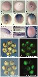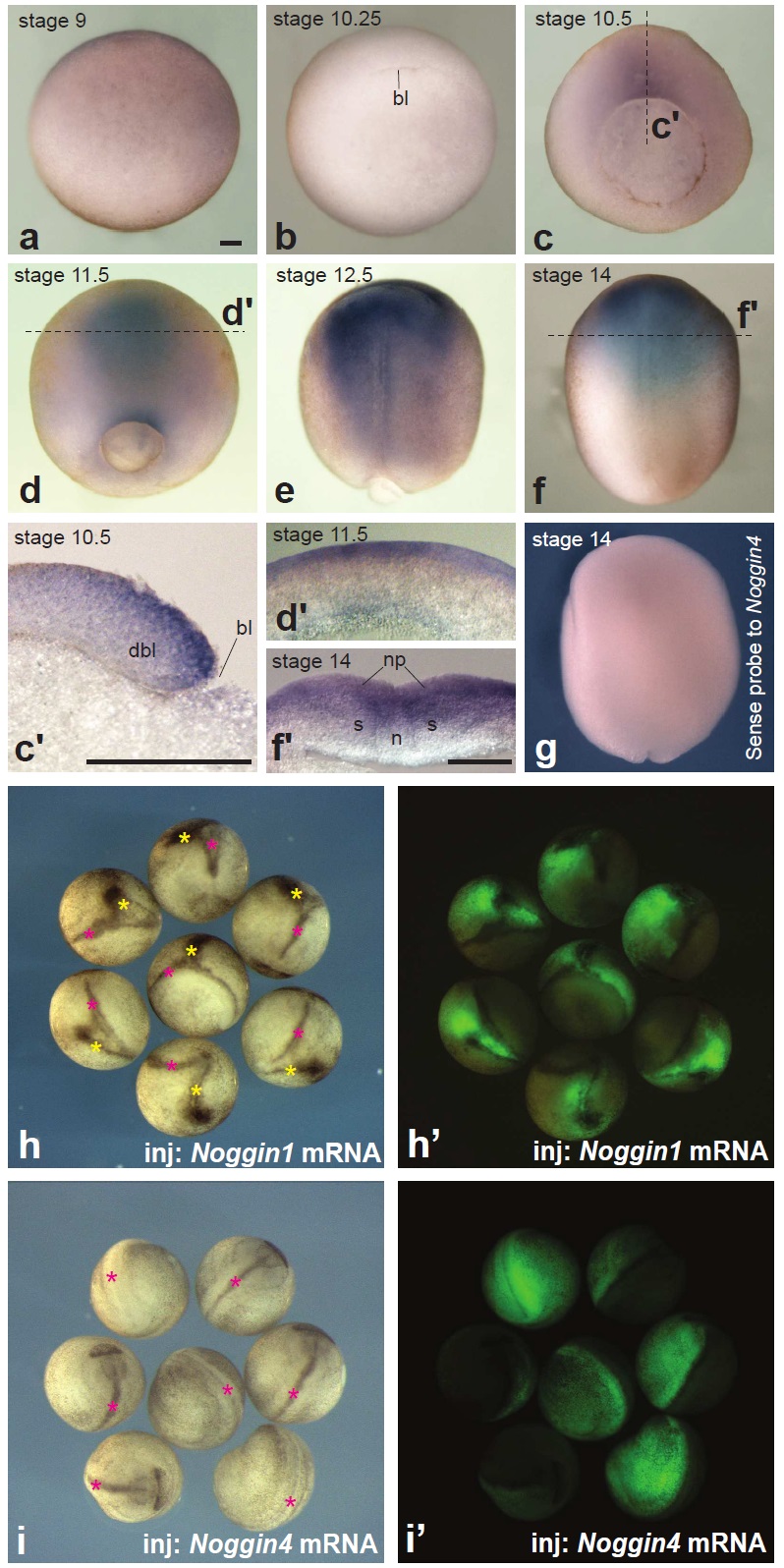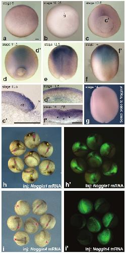 Figure S1. Analysis of the expression pattern of Noggin4 and its ability to induce secondary axes. (a-f) The expression pattern of Noggin4 on successive stages, from the late blastula (stage 9) till early-midneurulas (stage 14), as revealed by the whole-mount in situ hybridisation. Note, that at all these stages, a maximum of the expression is located within the presumptive anterior neural plate. All embryos are shown from the vegetal pole, anterior to the top. (cââfâ) Vibratom sections of embryos at stage 10.5, 11.5 and 14 made as indicated on (c and e) by dashed lines. (g) Control in situ hybridization with sense probe to Noggin4 mRNA. (h and hâ) Injection of 15 ng/blastomere of Noggin1 mRNA mixed with FLD, into the equatorial zone of ventral blastomeres at 4-cell stage induces formation of secondary body axes (98%, n=120; red asteriskâ main axis; yellow asteriskâ secondary axis). (i and iâ) By contrast, injections by the same way of even 150 ng/blastomere of Noggin4 mRNA did not induce secondary axes at all (0%, n=120; asteriskâ main axis).Abbreviations: bl â blastopore, dbl â dorsal blastopore lip, n ânotochord, npâ neural plate, s â somite. Bar everywhere is 100 m. |