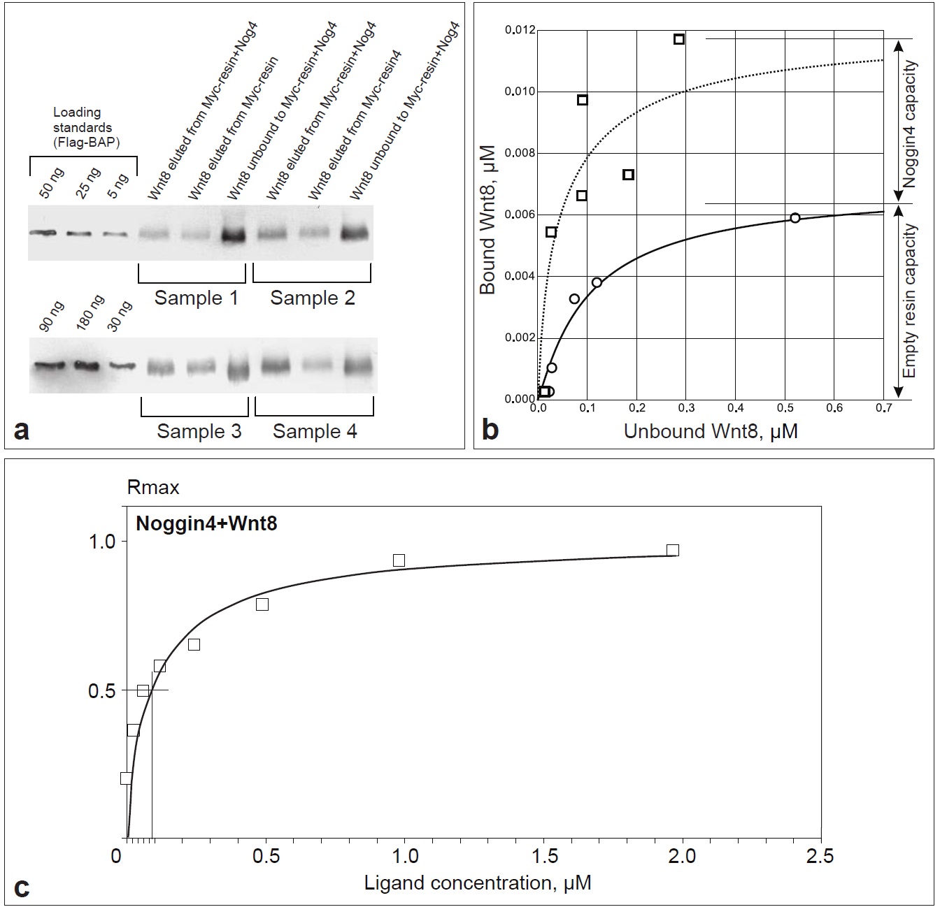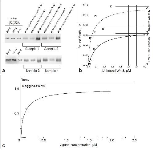 Figure S6. In vitro analysis of Wnt8 binding to Noggin4 by quantitative co-immunoprecipitation and Surface Plasmon Resonance assay. (a) Representative examples of Western blotting (WB) with antiFlag-antibody of indicated amounts of Flag-BAP (loading standard), Flag-Wnt8 eluted by Myc-peptide after incubation with Myc-Resin+Myc-Noggin4, Flag-Wnt8 eluted by Myc-peptide after incubation with Myc-resin+control samples and unbound Flag-Wnt8 after incubation with Myc-Resin+Myc-Noggin4. Loading standards and experimental samples were put on the same gels. (b) Adsorption isotherms drawn over experimental points (Table S2) obtained from WB images. Theoretical fits based on equations (3) and (4) are depicted with solid and dashed lines, respectively. Parameter values are provided in Materials and Methods. (c) Titration curves obtained from SPR measurements for interaction between immobilised Noggin4 and Wnt8. |