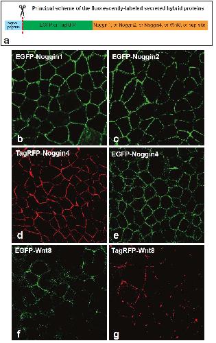 Figure S7. Noggin1, Noggin2, Noggin4 and Wnt8 fused to EGFP or TagRFP are secreted into the intracellular space of animal ectoderm of the Xenopus laevis embryos. (a) Principal scheme of the fluorescently-labeled secreted proteins. (b-g) Visualisation of the indicated fusion proteins in the intercellular space of the animal ectoderm of living Xenopus laevis embryos. Embryos at 4-cell stage were injected into animal blastomeres with mRNAs encoding indicated fusion proteins. At early-midgastruala stage, the injected embryos were photographed from the animal pole using the confocal microscope. |