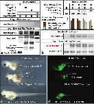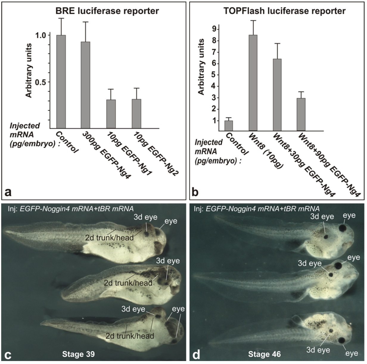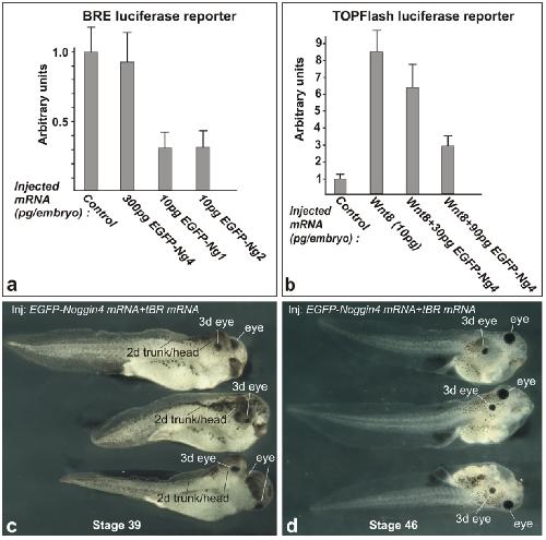 Figure S8. Fusions of Noggin1, Noggin2 and Noggin4 with EGFP retain their molecular and physiological activities. (a) EGFP-Noggin1 and EGFP-Noggin2 inhibit expression of the BMP-specific luciferase reporter, BRE, in Xenopus laevis embryos. The embryos were injected with BRE reporter plasmid, either alone (control) or mixed with EGFP-Noggin1 or EGFP-Noggin2 mRNAs. (b) EGFP-Noggin4 inhibits expression of the Wnt/b-Catenin-specific luciferase reporter, TOPFlash, in Xenopus laevis embryos. The embryos were injected either with TOPFlash reporter mixed with XWnt8 mRNA (control) or with TOPFlash reporter plasmid mixed with XWnt8 mRNA and increasing concentrations of EGFP-Noggin4 mRNA. (c and d). EGFP-Noggin4 mRNA co-injected with mRNA of the BMP inhibitor, truncated BMP receptor tBR, induces development of secondary trunk and head structures (better visible on c), including cyclopic eyes, in Xenopus laevis tadpoles (50%, n=70). Two different sets of tadpoles (obtained in the independent experiments) were photographed at stage 39 and 46 respectively. On c two upper tadpoles are shown from the right side and the bottom tadpole is shown from the ventral side. On d two upper tadpoles are shown from the right side and the bottom tadpole from the left side. |