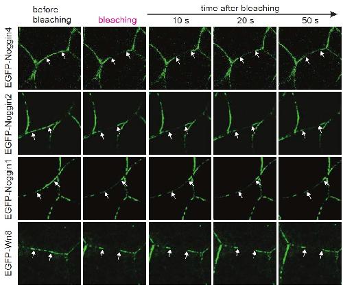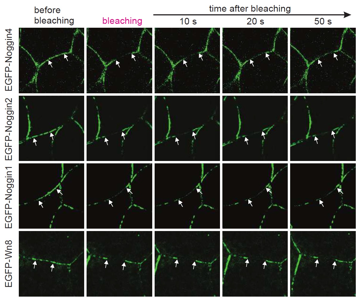 Figure 4. Analysis of Noggins and Wnt8 diffusivity.(a) Representative snapshot images of the photobleaching procedure of EGFP-Noggin4 in IS. Arrows indicate the margins of the bleached region. Snapshots for other studied proteins are presented at Fig. S9. Representative examples of EGFP-Noggin4 (b) and EGFP-Noggin1 (c) FRAP kinetics in single zones of the ectodermal IS. Equations and curves that fit the obtained data sets are shown under the curves. |