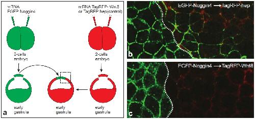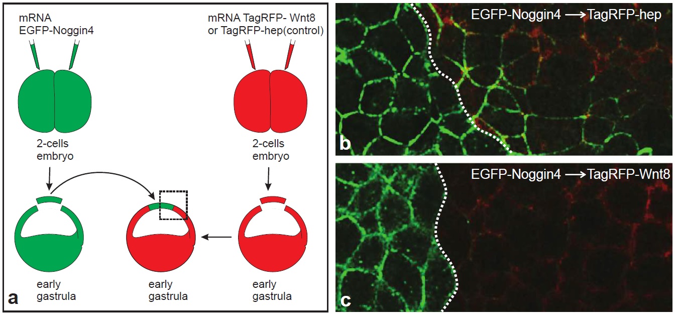Figure S12. Investigation of Noggin4 interaction with Wnt8 via the transplantation assay. (a) Schematic of the experiment. The region shown in b and c is framed by a dashed rectangle. (b and c) The diffusion of EGFP-Noggin4 from the transplant spreads substantially faster in the IS of the recipient embryo that secretes TagRFP-hep (c) compared with the recipient embryo that secretes TagRFP-Wnt8 (b). In each case, the border between the transplant and the recipient tissues is marked by a white dotted line. Animal pole view. |