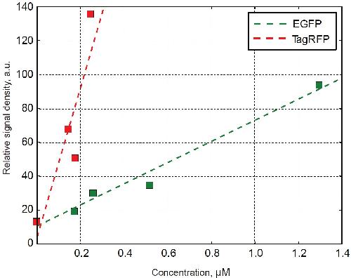 Figure S14. Calibration of the confocal microscope. Calibration curves for EGFP (green) and TagRFP (red) proteins under the most usable microscopy settings. |